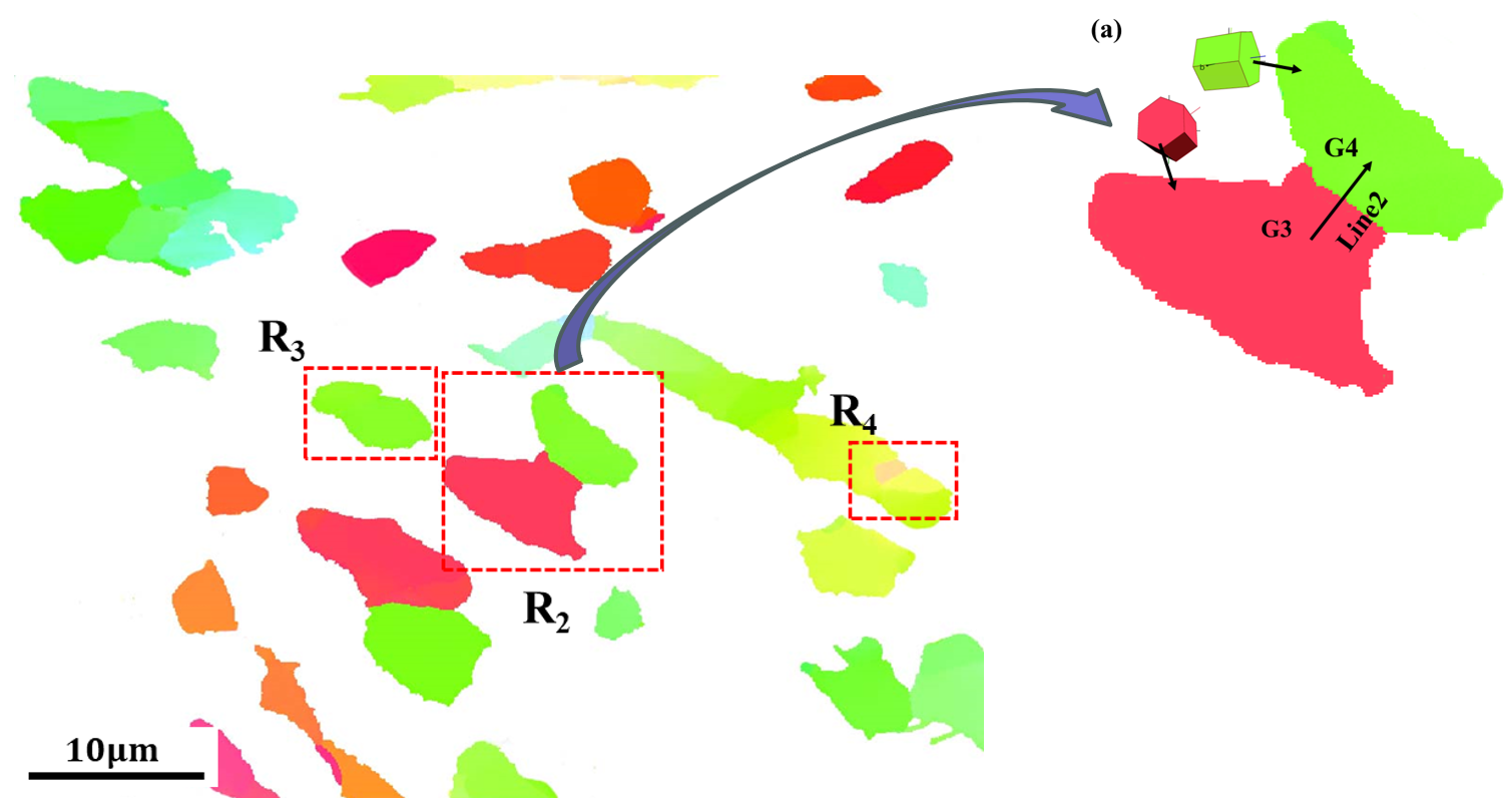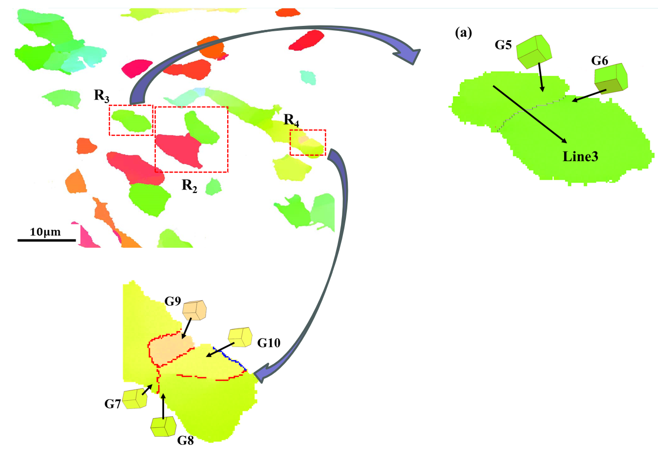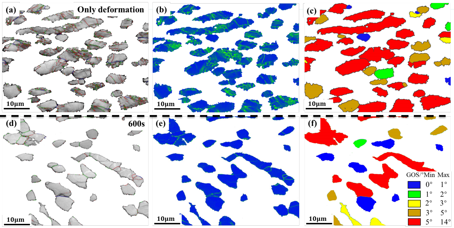 保温过程中静态再结晶消耗大量位错,位错密度急剧减少;静态回复导致大量存在低角度晶界,并构成多个位错墙,低角度晶界的两侧取向存在明显差异。