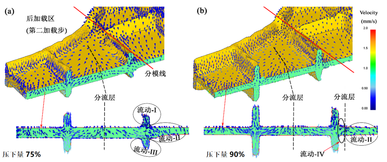 后变形区域的材料流动;流动-III:材料充填分模线位置的下筋筋槽;在邻近分区筋的未加载区产生一个新分流层,加载区的材料不再转移至未加载区;流动-IV:已转移材料逆向流动,充填分模线位置筋槽。
