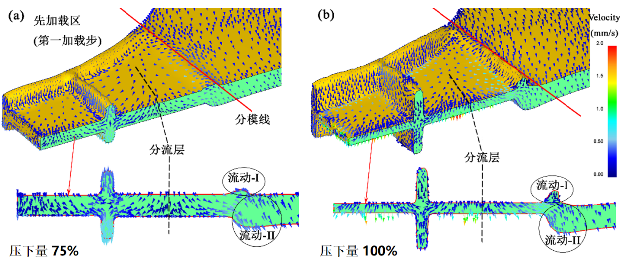 先变形区域的材料流动;腹板处材料沿着分流层往两端流动,其中一端材料跨变形区流动;流动-I:材料充填分模线位置的上筋筋槽;流动-II:转移至未加载区域中