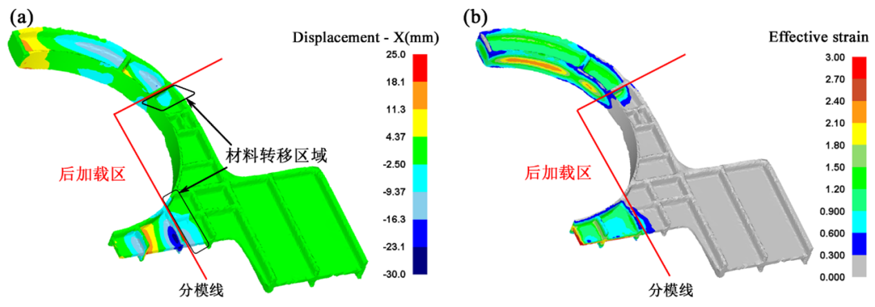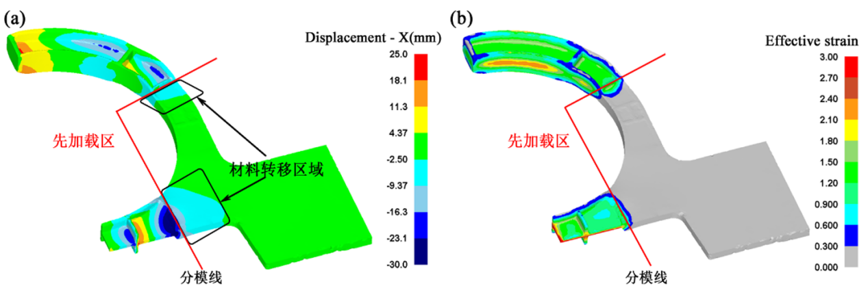 后变形区域的位移场和应变场;位移和应变在分模线至未加载区的首根筋呈梯度减小的变化趋势;第二加载步材料转移的影响范围小于第一加载步的影响范围。