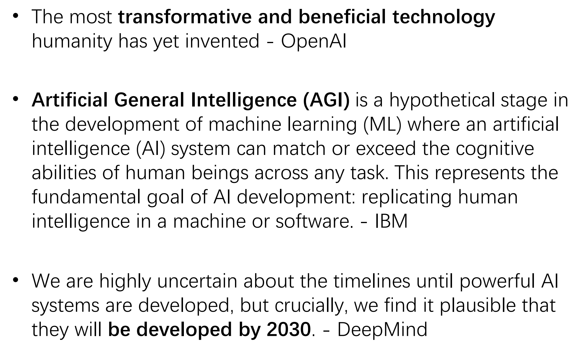 通用人工智能(AGI)代表超越人类跨领域认知能力的终极目标,OpenAI称其为"最具变革性的技术"。DeepMind预测2030年前可能突破,但学界存在分歧:LeCun质疑LLM无法实现AGI,Hinton警告失控风险,而Schmidt强调"赢得AI竞赛者将主导世界"。
