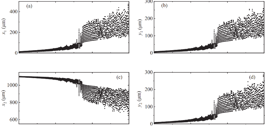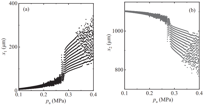 另外,对比考虑移动情况下的双气泡系统与三气泡系统中气泡位置的分岔图,可以发现三气泡系统中气泡位置的混沌变化会在更低幅度驱动声压处出现,即气泡数量的增加也会使得振动系统非线性有所增强。