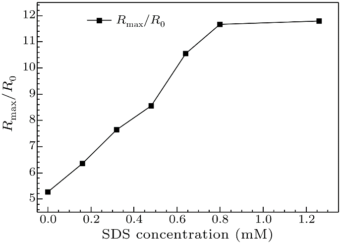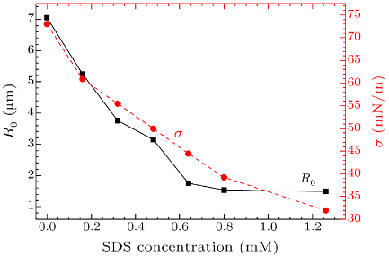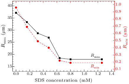 汇报人对超声空化气泡动力学进行了研究。通过锁相积分的方式拍摄了表面活性剂溶液中的单气泡脉动,讨论了表面活性剂对气泡动力学行为的影响。研究表明,十二烷基硫酸钠(SDS)浓度越大,(1)气泡平衡半径越小;(2)气泡最大半径和最小半径越小;(3)气泡最大半径与平衡半径的比值增大。注意到上述值在表面活性剂达到一定浓度后均会趋向于饱和。