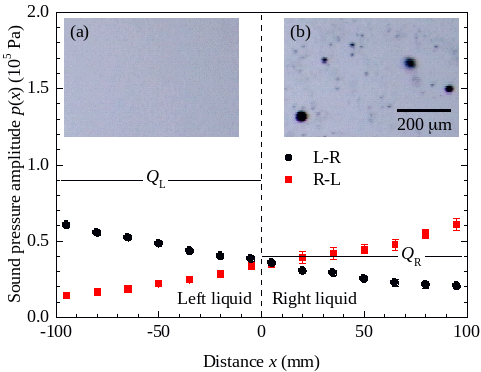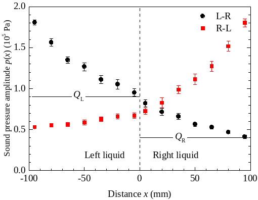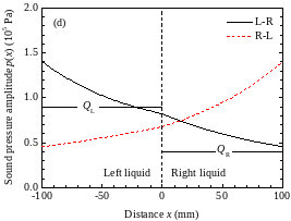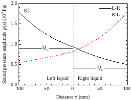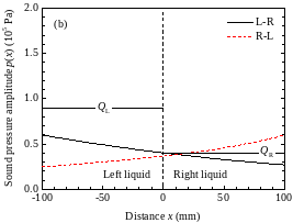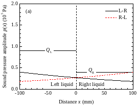 对空化液体中超声传播进行了理论和实验研究。在实验中发现,可利用变空化阈值液体实现声波在液体中的不对称传播。对于模式1而言,当声波从左向右传播时,声压始终低于液体空化阈值,液体中无空化现象产生,声能量衰减较少,右侧输出声能量较大。当声波从右侧向左侧传播时,由于声波在右侧液体中传播时声压高于空化阈值,声能量衰减较快,左侧输出声能量较低。