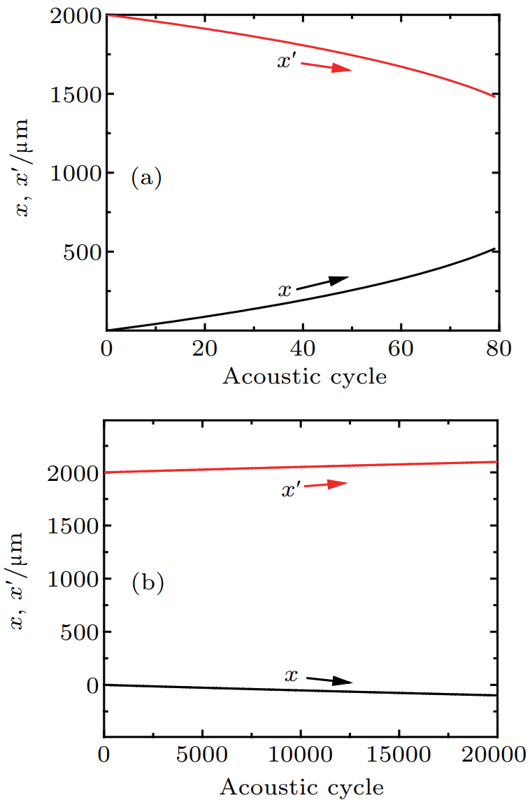 通过数值求解移动双气泡动力学方程,研究了双气泡系统中气泡移动规律与气泡相位和驱动声压幅度的关系。研究发现,(1)两气泡脉动相位接近则相互靠近,相位远离则相互排斥;(2)驱动声压幅度越低,气泡越容易相互接近。