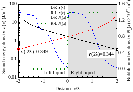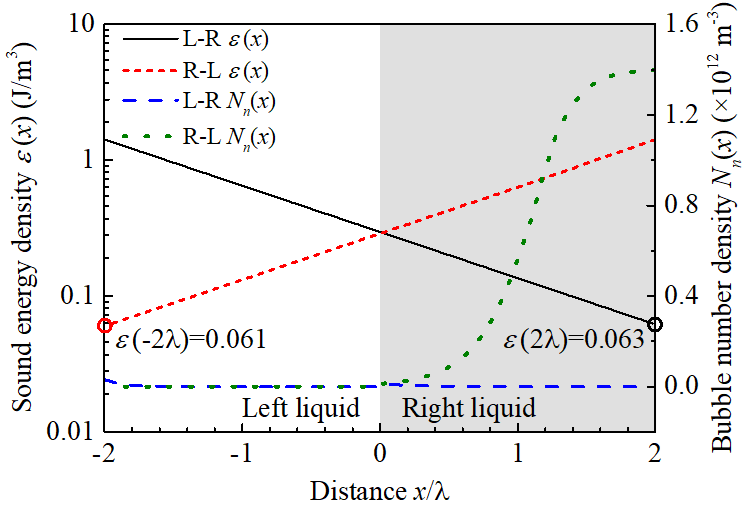 也可以不对气泡动力学方程进行线性化,而是直接联立求解耦合气泡动力学方程和声传播方程,得到空化液体中不同位置处声压和气泡半径随时间的变化规律,并计算液体中声能量,对实验现象进行验证。