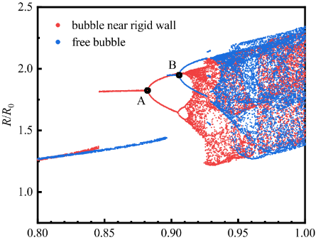 数值求解气泡动力学方程,基于庞加莱分析法和分岔图,对单气泡和多气泡系统中气泡脉动和平移的非线性特性进行了讨论。研究表明,若气泡存在于刚性壁面附近,则刚性壁面对气泡辐射声波的反射会使得气泡的分岔和混沌在更低的驱动声压处出现,即在一定程度上增强气泡脉动的非线性特性。